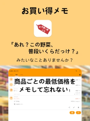 お買い得メモ〜最低価格を忘れない〜お買い物便利底値メモは、日々変動する商品の底値や最安価格を記録し、賢くお得なお買い物をサポートする無料アプリです。お店や数量・容量、税込み・税抜き価格もメモでき、単位あたりの価格比較も簡単。もう「今日の特売、本当に安い?」と悩むことはありません。便利なバックアップ機能も搭載。