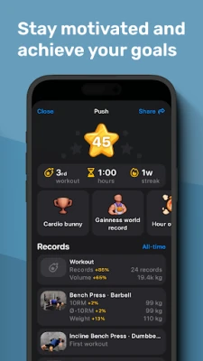 日々のワークアウトは、直感的なトラッカーで詳細に記録。レップ数、重量、RIR(予備レップ数)はもちろん、メモ機能や便利なレストタイマーが、トレーニングの質を高めます。努力の積み重ねはグラフやインサイトとして可視化され、トレーニング履歴や筋肉の成長を客観的に把握。さらに、期間設定による包括的なピリオダイゼーション機能を利用すれば、トレーニングサイクルやデロード期間を計画的に組み込み、継続的な成長を促すことができます。達成したパーソナルレコードやマイルストーンを称える機能が、常にあなたを鼓舞し、モチベーションを維持する手助けとなるでしょう。作成したトレーニングプランを友人やクライアントと共有したり、トレーニングデータをCSV形式でエクスポートして詳細に分析することも可能です。