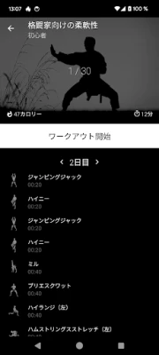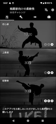 このアプリには、初心者から上級者まで、あらゆるレベルに対応した30日間プログラムが用意されています。一つ一つのストレッチには、動きのポイントを捉えたアニメーション解説が付いており、正しいフォームを習得できます。さらに、音声ガイド機能を使えば、画面から目を離しても集中してトレーニングを継続可能。トレーニング履歴で着実に進捗を記録し、成果を目で見て実感できます。また、キックボクシング、柔術、カポエイラなど、多様な格闘技のニーズに応えるカスタムワークアウト作成機能も搭載し、あなただけの最適なプログラムを構築できます。