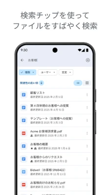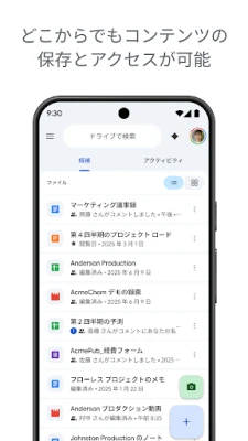 Google ドライブは、あなたのデジタルライフを安全かつスマートに統合する、信頼できるクラウドストレージです。デバイスや場所を選ばず、大切なファイルにいつでもアクセスし、編集できる自由を提供します。PDF、Officeドキュメント、動画など、100種類を超える多様なファイルをこれ一つで管理可能。デバイスカメラで紙の書類をスキャンし、即座にデジタル化できます。最近使用したファイルや重要なドキュメントへの素早いアクセス、ファイル名や内容での検索に加え、種類や更新日による詳細なフィルタリングで、必要な情報を迷わず見つけ出します。