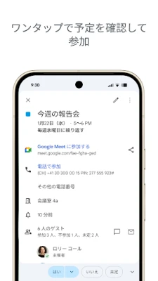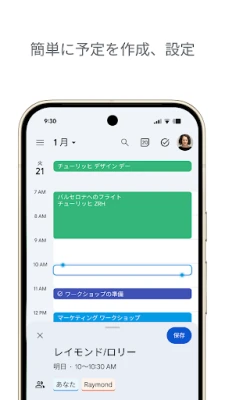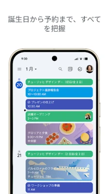 Google カレンダーは、あなたの忙しい日々をスマートにオーガナイズし、個人とチームの生産性を最大限に引き出すための強力なツールです。Gmailから自動でフライト、ホテル、コンサート、レストランの予約情報を瞬時に取り込み、手動入力の手間を省きながら、大切な予定を見落とす心配を解消します。スマートフォン、タブレット、Wear OSデバイス、そしてパソコンまで、お使いのGoogleアカウントを通じてすべてのデバイス間でスケジュールを常に同期。どこにいても、いつでも最新のあなたの世界にシームレスにアクセスできます。直感的な月、週、日表示の切り替えで、どんな状況でも最適な視点でスケジュールを把握し、ライトモードやダークモード、鮮やかな色分けでGoogle カレンダーをあなた好みにパーソナライズできます。